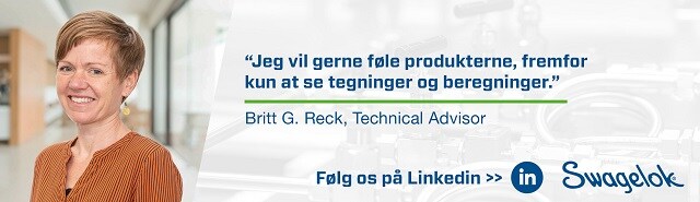 Med stor proces kendskab fra sin erfaring i både offshore olie og gas, vindindustri, - fødevareindustri og med sin deltagelse i bygning og drift, af testanlæg til ny teknologi, har Britt formået at tilegne sig en stor og nuanceret forståelse, for de tekniske processer- Det spiller en central rolle, i funktionen hos Swagelok men også overfor kunderne – og noget som afspejler sig i en af Swagelok’s værdier – “Provide high value and high performance in our products, processes, and services”