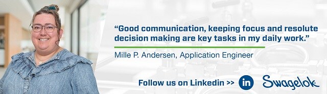 Mille was hired by Swagelok in April 2023, as Application Engineer. She is trained as a Chemical engineer. She has, however, always worked within process systems. With 14 years of experience from offshore oil and gas and later renewable energy, she is the perfect fit for our team. Her focus has been on developing new technologies for, e.g., cleaning of produced water and production of electricity from salt water. Also, she has experience within design and risk assessment of electrolysers for hydrogen production.